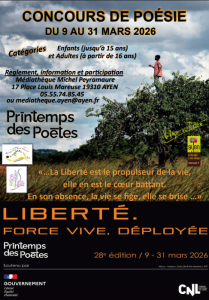La Médiathèque Michel PEYRAMAURE à AYEN et l'Association LE PUY AUX MUSES, vous proposent de participer au concours de poésie, organisé du 09 au 31 Mars , dans le cadre de la manifestation nationale LE PRINTEMPS DES POÈTES sur le thème de l'édition 2026 "La liberté, force vive déployée". «…La Liberté est le propulseur de la vie, elle en est le cœur battant. En son absence, la vie se fige, elle se brise …»