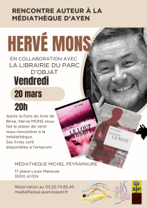 La Médiathèque Michel Peyramaure d’Ayen a le plaisir d’accueillir Hervé Mons en collaboration avec la Librairie du parc, vendredi 20 mars à 20h.