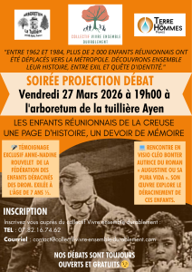Le collectif Vivre Ensemble Durablement en partenariat avec l'arboretum de la Tuillière et Terre des Hommes France vous proposent une projection débat le vendredi 27 mars à 19 h à l'arboretum de la Tuillière d'Ayen sur les enfants réunionnais de la Creuse.