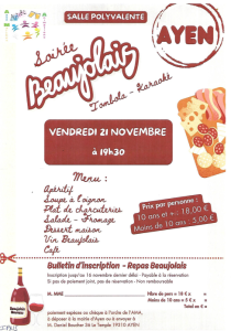 Soirée Beaujolais vendredi 21 novembre à 19h30, salle des fêtes d'Ayen