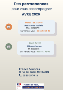 Des permanences sont prévues à France Services.pour vous aider dans certaines démarches. Pour plus de renseignements, vous pouvez contacter les animatrices Julie et Aurélie au 05 55 25 76 12