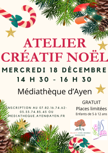 Nathalie attend les enfants mercredi 18 décembre de 14h30 à 18h30, à la médiathèque pour un nouvel atelier créatif autour de Noël. Gratuit. Inscriptions obligatoires au 05 55 74 85 45