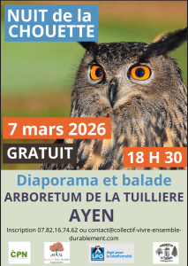 Le Club Connaître et Protéger la Nature d'Ayen en partenariat avec l'Arboretum de la Tuillière et la LPO, vous proposent une soirée consacrée aux rapaces nocturnes. Comment reconnaître les chouettes et les hiboux ? Comment les protéger ? Qu’y a-t-il dans les mystérieuses pelotes de réjection. Nous vous proposons de nous retrouver le samedi 7 mars à 18 h 30 à l'arboretum de la Tuillière d'Ayen afin de vous parler de ces oiseaux discrets et fascinants.