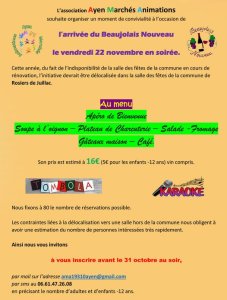 L'association Ayen Marchés Animation vous propose de fêter l'arrivée du Beaujolais nouveau, vendredi 22 novembre 2024 en soirée.