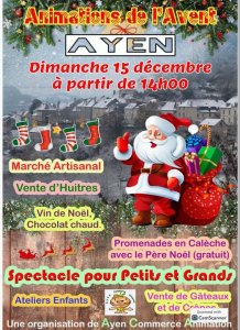 Le Père Noël fera un arrêt à Ayen. Tout un programme est prévu pour les enfants : promenade en calèche, ateliers, etc... Un spectacle sera présenté , vente de gâteaux, crêpes, etc....