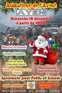 Petits et grands sont attendus au marché de l'Avent organisé par Ayen Commerces Animations, dimanche 18 décembre à partir de 14h, place des marchés de pays.Le Père Noël fera un arrêt à Ayen. Les enfants pourront faire une photo souvenir avec lui. Tout un programme est prévu pour les enfants : promenade en calèche, ateliers maquillage, percussion, cartes de Noël etc.. seront proposés aux enfants. Un spectacle "les trois trésors" de Gyraf sera présenté à 16h, vente de gâteaux, crèpes, etc....