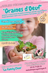 Accueil > VIE ASSOCIATIVE > Agenda des manifestations > Atelier pédagogique "graines d'oeuf" à la médiathèque Samedi 7 mars 2026 à 10h30